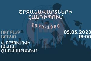 Ս.թ. մայիսի 5-ին՝ ժամը 19:00, Վ. Բրյուսովի անվան պետական համալսարանի 2-րդ մասնաշենքի բակում  ԲՊՀ Շրջանավարտների միավորումը կազմակերպում է «Ուրբաթ երեկո Վ. Բրյուսովի անվան համալսարանում», 1970-1980 թթ. շրջանավարտների հանդիպումը: